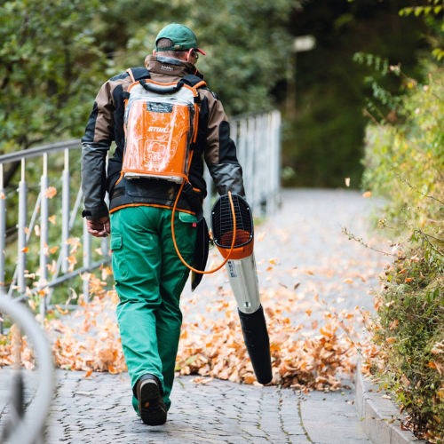 Quando os municípios e os paisagistas realizam trabalhos de limpeza em áreas sensíveis ao ruído, o volume do equipamento utilizado é um fator crucial para o ambiente. Portanto, com o soprador de mochila a bateria BGA 300, reduzimos significativamente o nível de ruído o novo Sistema de Redução de Ruído da STIHL.