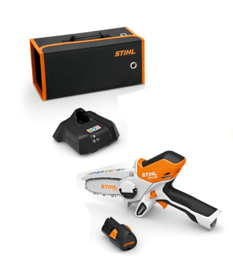 Kit completo do potente mini-podador de corrente da STIHL, com bateria AS 2, carregador AL 1 e bolsa de transporte e armazenamento